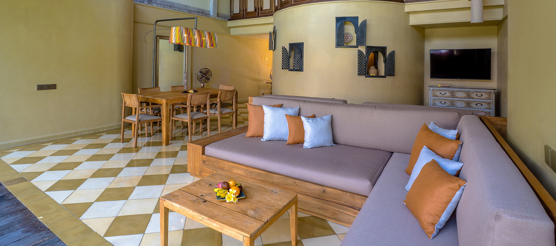 客厅 & 用餐区沐浴在自然光与大气闪耀通过. 柔和的抛光地砖和拱形窗户的主题唤起一种放松心情. 你的管家准备早餐, 从我们的菜单或午餐或晚餐享受我们的流行烧烤. 放松与游泳池在舒适的沙发上,并在您的面前花园或与电视娱乐的背后, 所有地融入自然环境.